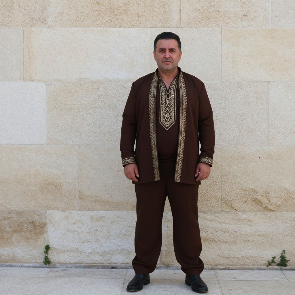 Turkish Costume Male, man in a brown outfit standing in front of a stone wall