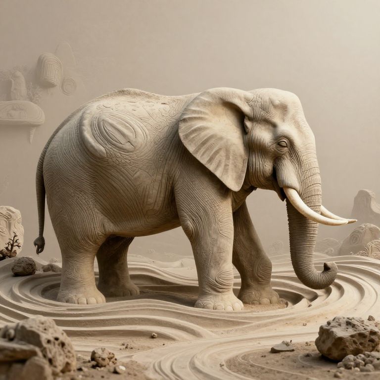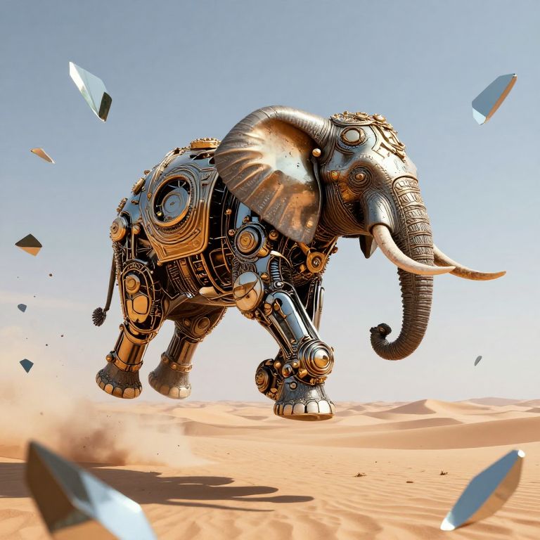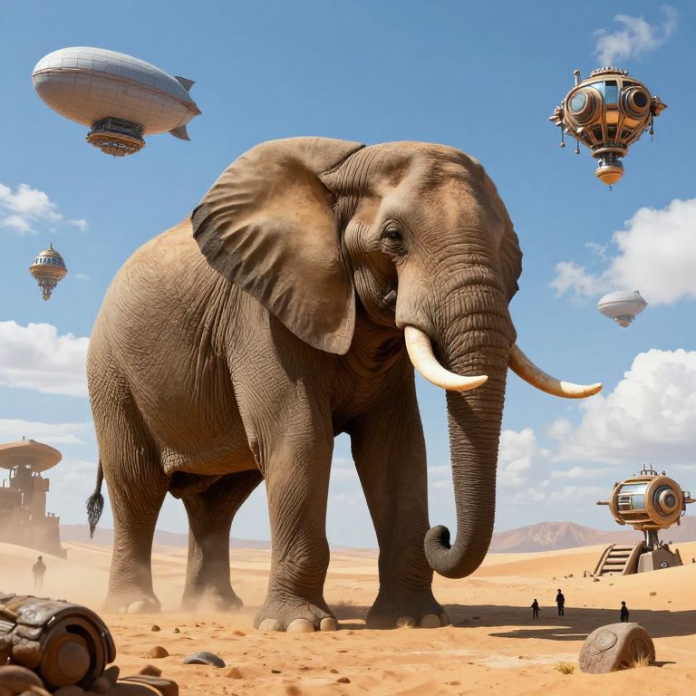Photorealistic digital illustration of a vast desert landscape featuring a massive, gray-skinned, African elephant with large white tusks standing prominently in the center. Three white, airship-like blimps hover in the bright blue sky with scattered clouds. Two small human figures, dressed in brown and black, stand in front of the elephant, emphasizing its enormous size. The background includes ancient, stone ruins to the left and right, and sandy dunes stretching across the scene. The elephant's textured skin and the blimps' sleek surfaces contrast with the rough, sandy ground and rocky foreground.