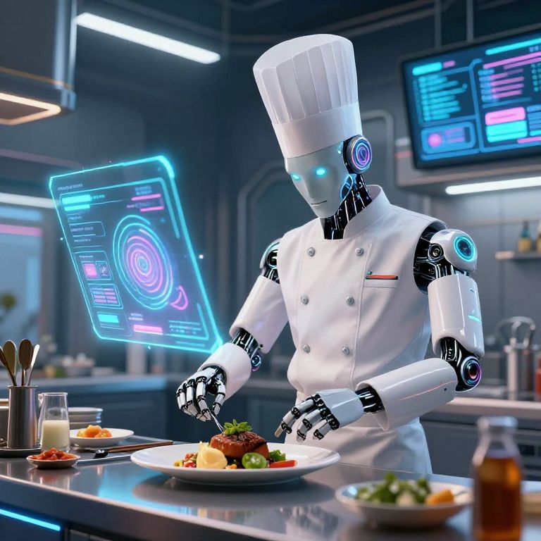 Nom: a futuristic robot chef enthusiastically preparing a delicious meal in a sleek, high-tech kitchen filled with glowing screens and holograms, showcasing the blend of technology and culinary art, cyberpunk aesthetic with neon highlights.