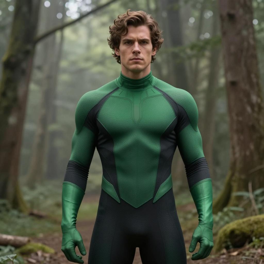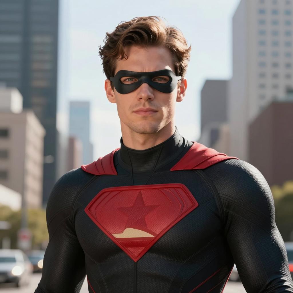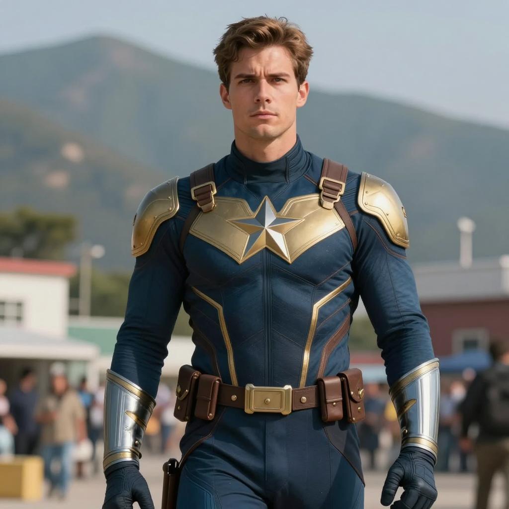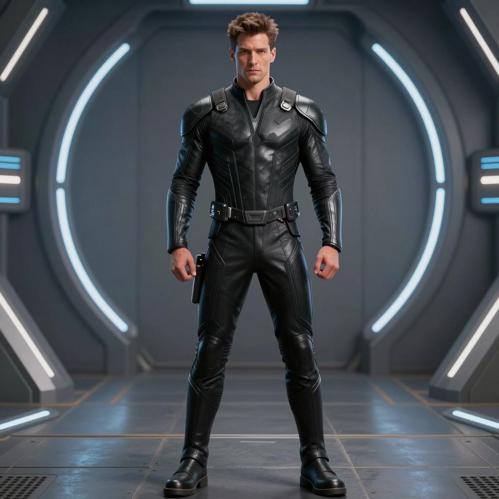 Futuristic costume male, photo-realistic CGI, male superhero, standing, wearing black leather suit with futuristic geometric patterns, short brown hair, serious expression, sci-fi background, metallic circular structures with blue and white lights, muscular build, high detail, realistic ures, studio lighting, full body shot, front view, no visible jewelry, sleek and modern design, hero costume, digital art, high quality, sci-fi aesthetics