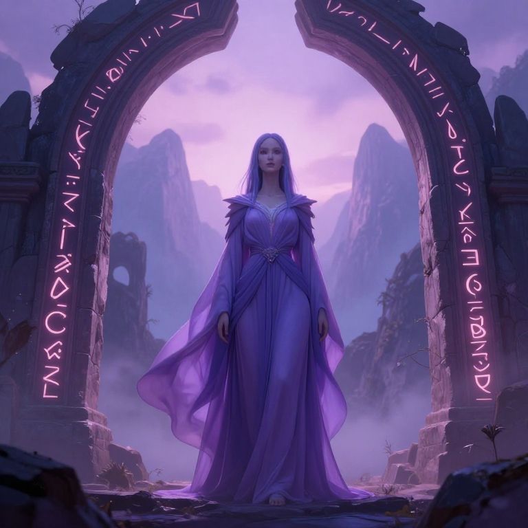 A digital fantasy artwork depicts a regal, pale-skinned woman with long, flowing purple hair standing within a broken, ancient stone archway. She wears a sheer, lavender gown with intricate, flowing sleeves and a deep neckline, revealing a hint of cleavage. The archway, adorned with glowing, purple runes, frames her against a misty, mountainous backdrop. Her serene expression and commanding presence exude mystique. The scene is bathed in a soft, purple hue, adding a magical, ethereal atmosphere to the ruined, overgrown landscape.