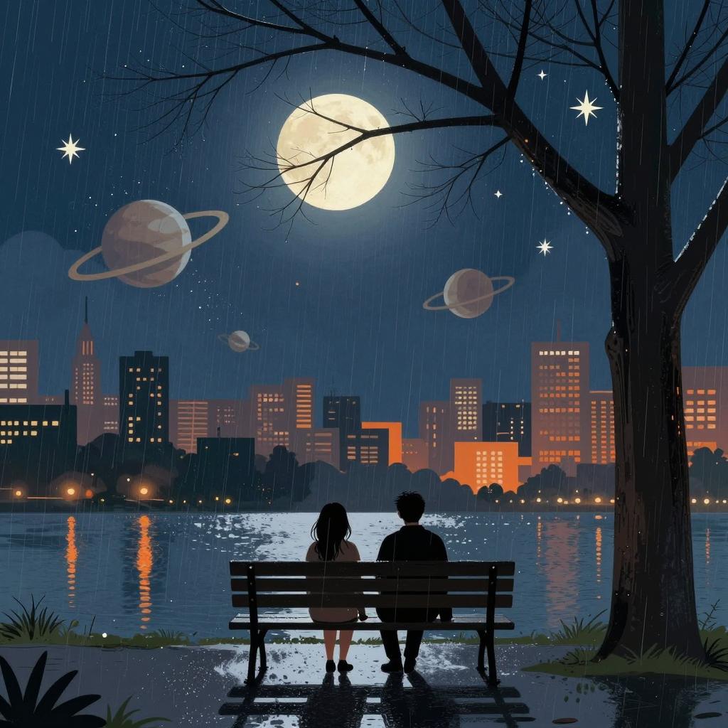 Illustration of a rainy night scene. A couple with a blue umbrella stands on a wet, reflective walkway. The woman in a yellow dress, the man in a black coat. Lamp posts line the path. Trees with orange leaves on the left. Other people in the background. Bright city lights in the distance. Raindrops visible on the ground.