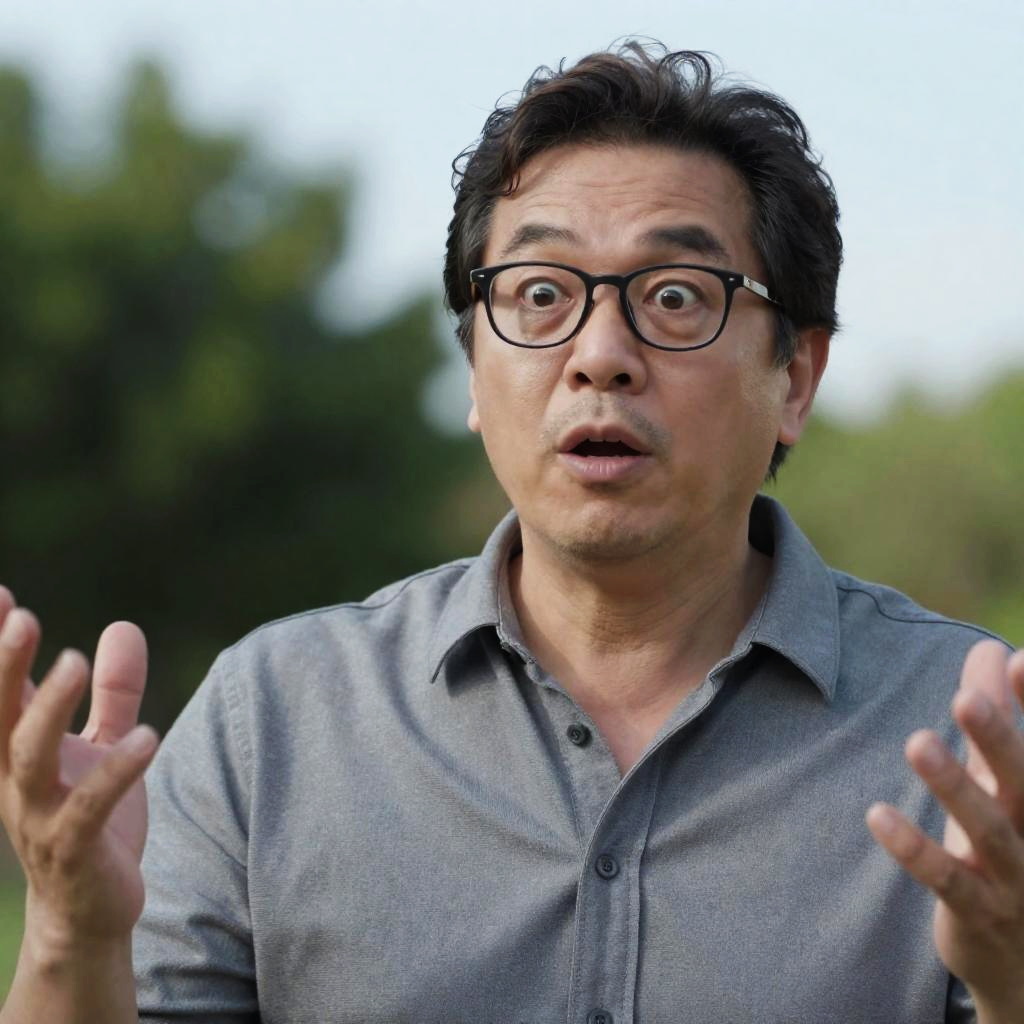 Middle-aged man with dark, wavy hair and black glasses, wearing an unbuttoned gray shirt, looking surprised. Background: blurred green plants and blue sky. Daylight, outdoors. Hands partially visible, slightly raised. Expressive, wide-eyed facial expression. Single person.
