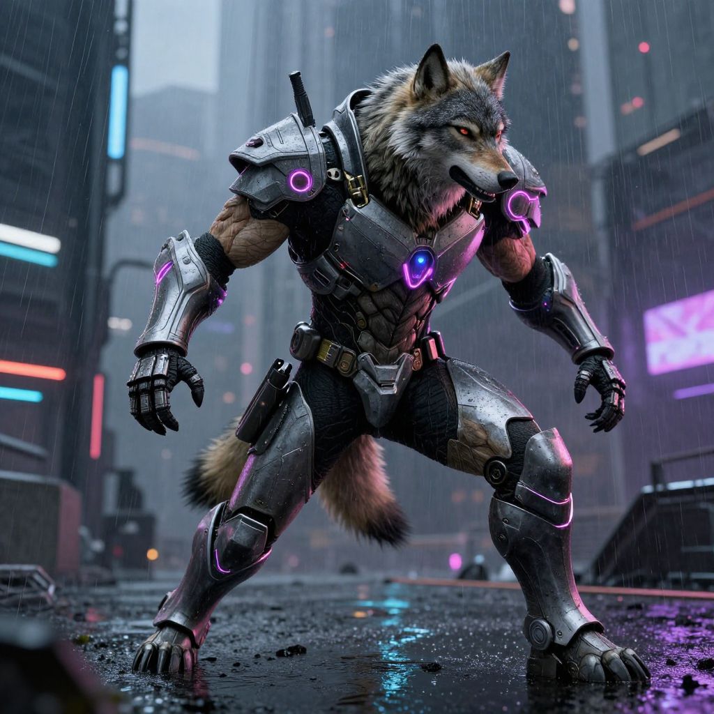 Anthromorph warrior in dynamic pose, combining human anatomy with wolf-like traits, clad in futuristic armor, neon accents, cyberpunk cityscape background with rain and reflections, hyper-realistic style, dramatic lighting emphasizing muscles and fur texture.
