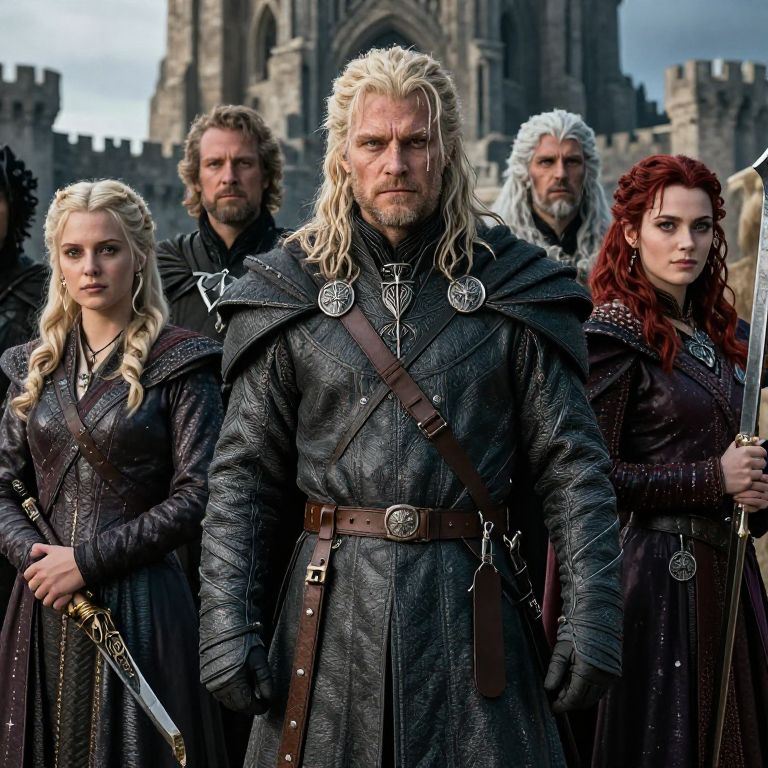 Ai generated Game of Thrones characters, intricate medieval fantasy attire, dramatic lighting, detailed facial expressions, epic castle background, highly stylized, rich textures, fantasy realism, dynamic poses, cinematic atmosphere, vibrant colors