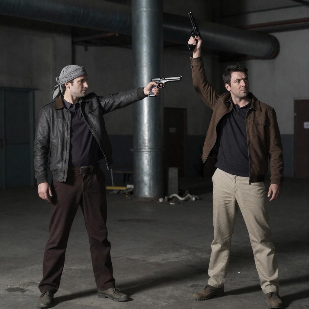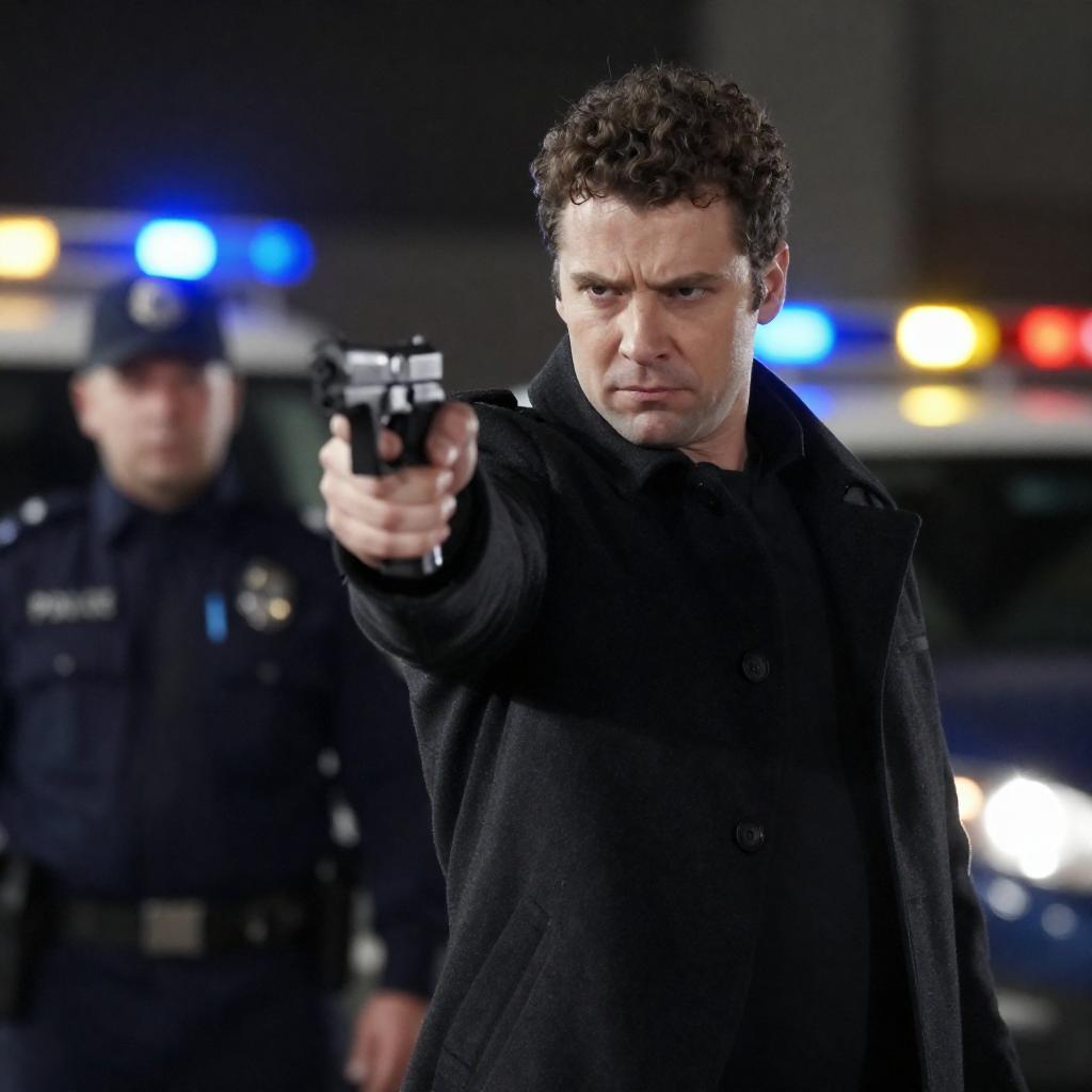 Photograph of a tense scene. A determined man with short, curly brown hair points a gun forward. He wears a dark, ured coat. In the blurred background, a police officer in a uniform stands to the left. Blue and yellow lights illuminate the background. The man's intense facial expression focuses on the gun.