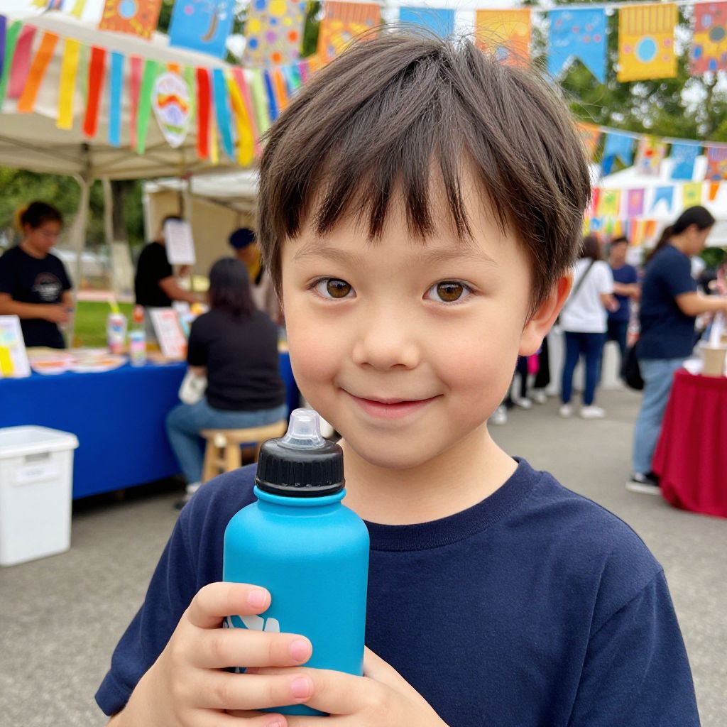 A child with bright hazel eyes and a round face is holding a blue water bottle with a smile on their face at a community outdoor fair, the setting bustling with colorful stalls and colorful banners in the background.