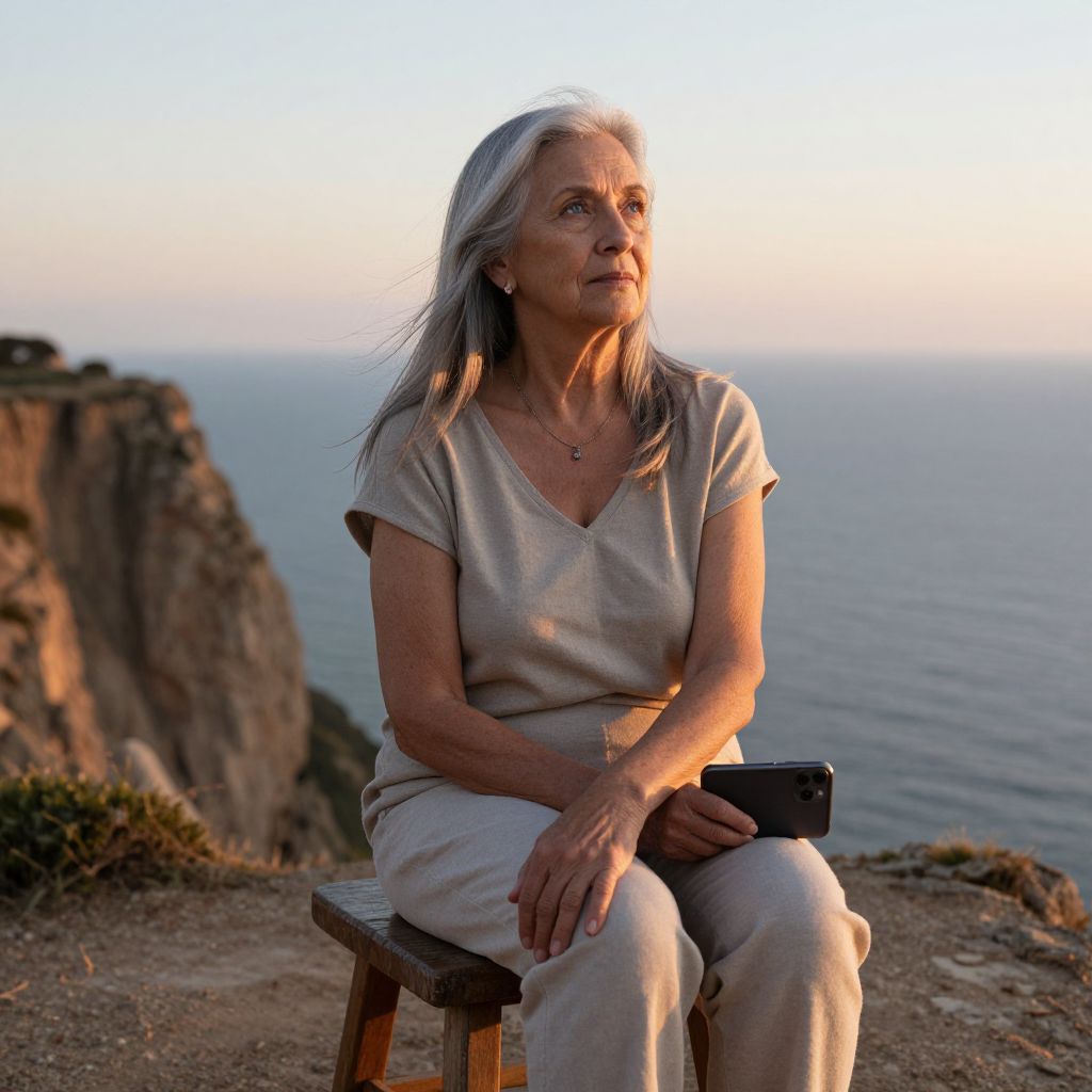 Photograph of an elderly white woman with long, gray hair sitting on a wooden stool at a coastal cliff during sunset. She wears a light beige V-neck shirt and matching pants, holding a black tablet on her lap. Her expression is contemplative, gazing into the distance. The background reveals a calm ocean and a rocky cliff on the left. The sky is a gradient of pink and blue, casting a warm glow on her face. Her skin is fair, and she has a delicate necklace. The image has a serene, reflective mood.