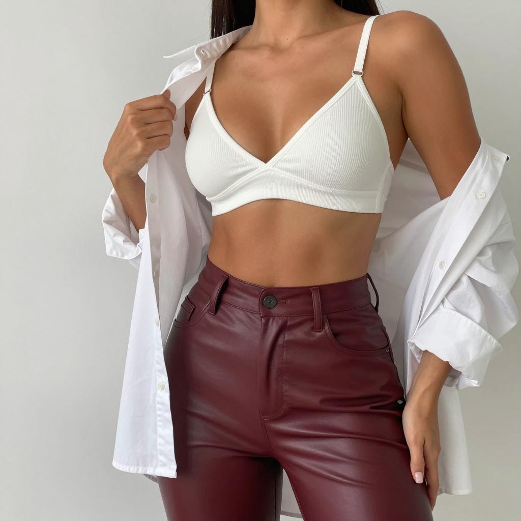 Photograph of a woman with tan skin and long brown hair, wearing a white ribbed tank top, beige high-waisted skirt, and beige furry jacket. She stands outside a black car, pulling the jacket open with both hands. Overcast sky, parking lot in background. Her face is not visible.