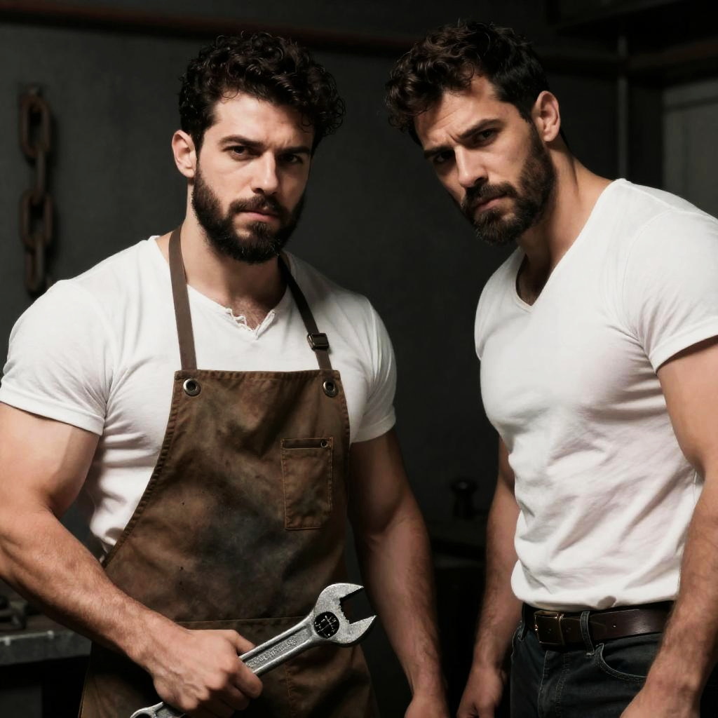Photograph of two muscular men in a dark, industrial setting. Both have dark, curly hair and beards. The man on the left wears a white shirt and dirty brown apron, holding a wrench. The man on the right, in a white shirt, leans forward with a serious expression. Chains are on the left wall.