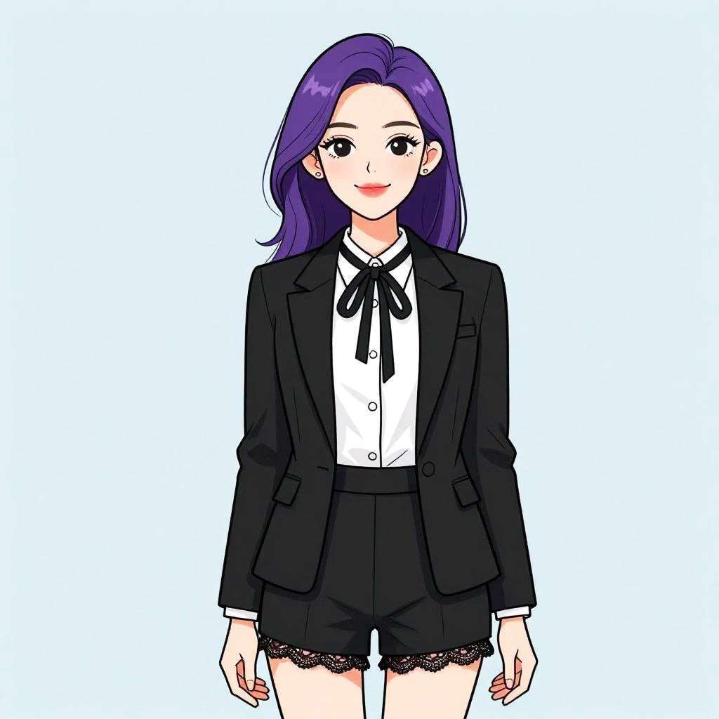 Digital anime-style drawing of a young woman with long purple hair, wearing a pink blazer, white tank top, and pink shorts.