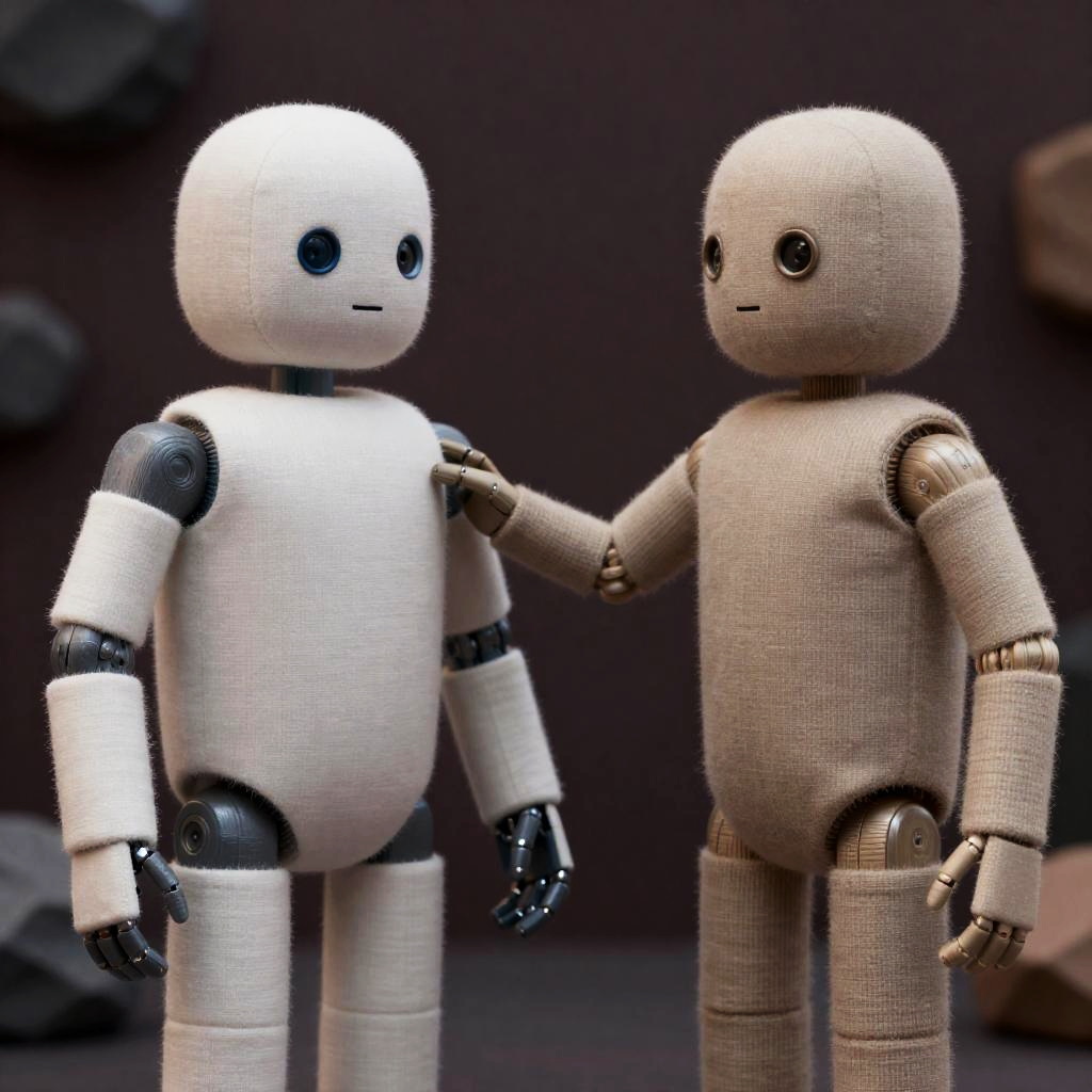 Three robotic humanoid figures with large, round eyes, wearing brown, mesh-like uniforms and helmets, stand close together. The central figure has a white, metallic head with multiple eyes, a worried expression, and a green pendant. The left figure has a gloved hand raised. The right figure holds a quiver of arrows. Dimly lit, cave-like background.