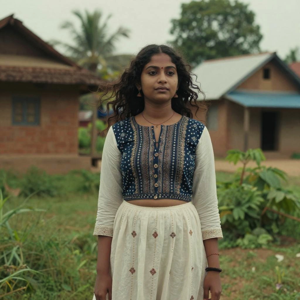 Photograph of a young Indian woman with medium brown skin and long, wavy black hair standing in a rural setting. She wears a white long-sleeve blouse with intricate blue embroidery on the chest and sleeves, paired with a high-waisted, white maxi skirt adorned with small red patterns. Her expression is neutral, and she stands in front of two brick houses with red and brown roofs, surrounded by greenery and tall grass. The background includes a blurred palm tree and another building with a blue roof. The overall scene is outdoors, under a cloudy sky.