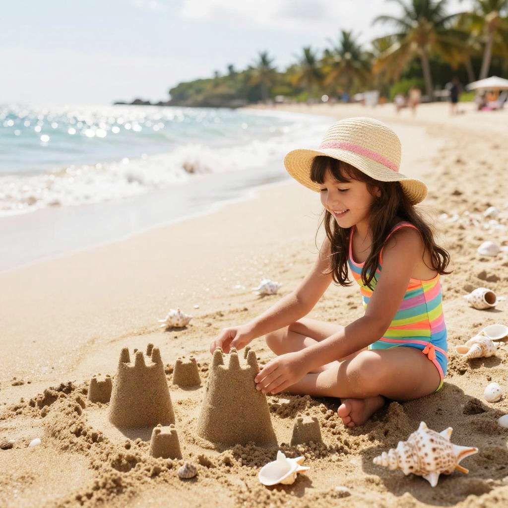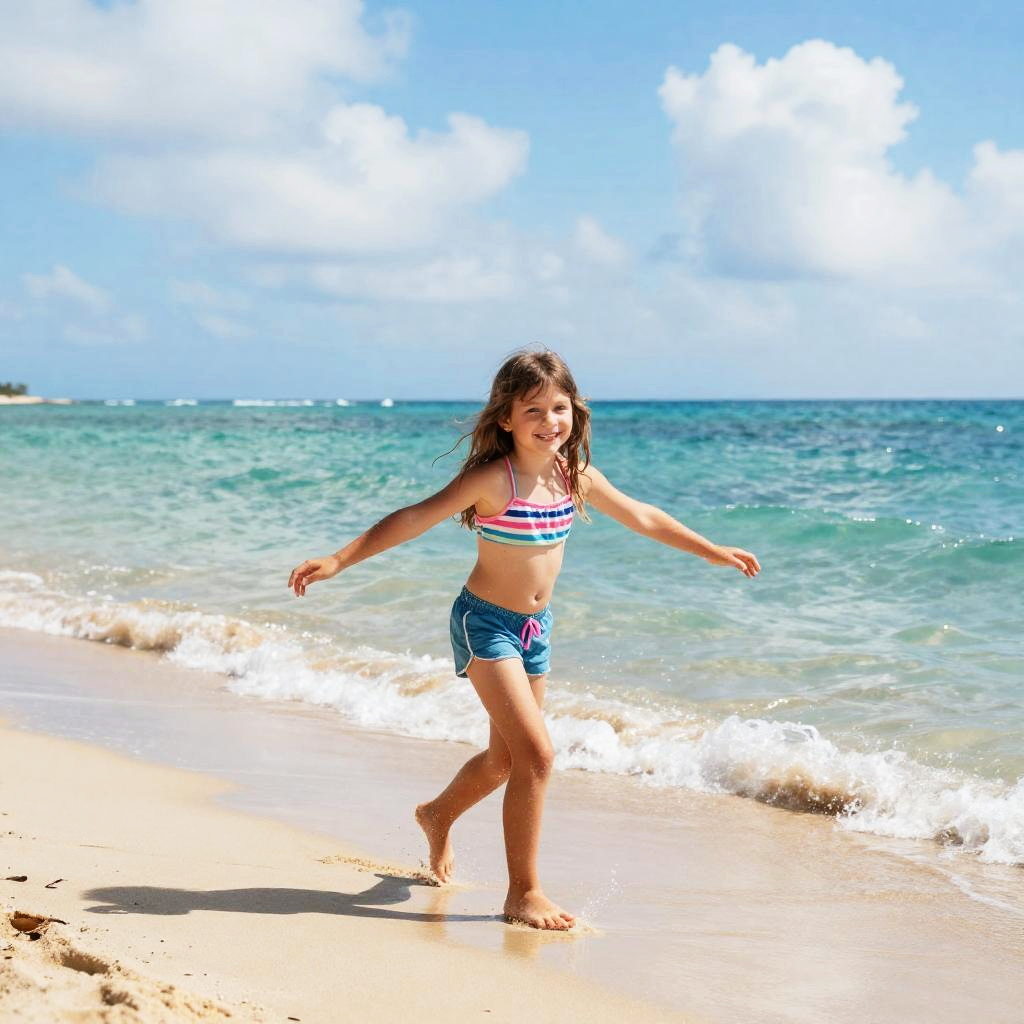 11 year old boy running along the shoreline, splashing water with bare feet, golden sand underfoot, wearing a red swimsuit and sunhat, sun shining brightly, clear turquoise ocean in the background, palm trees swaying gently, capturing a carefree summer beach moment
