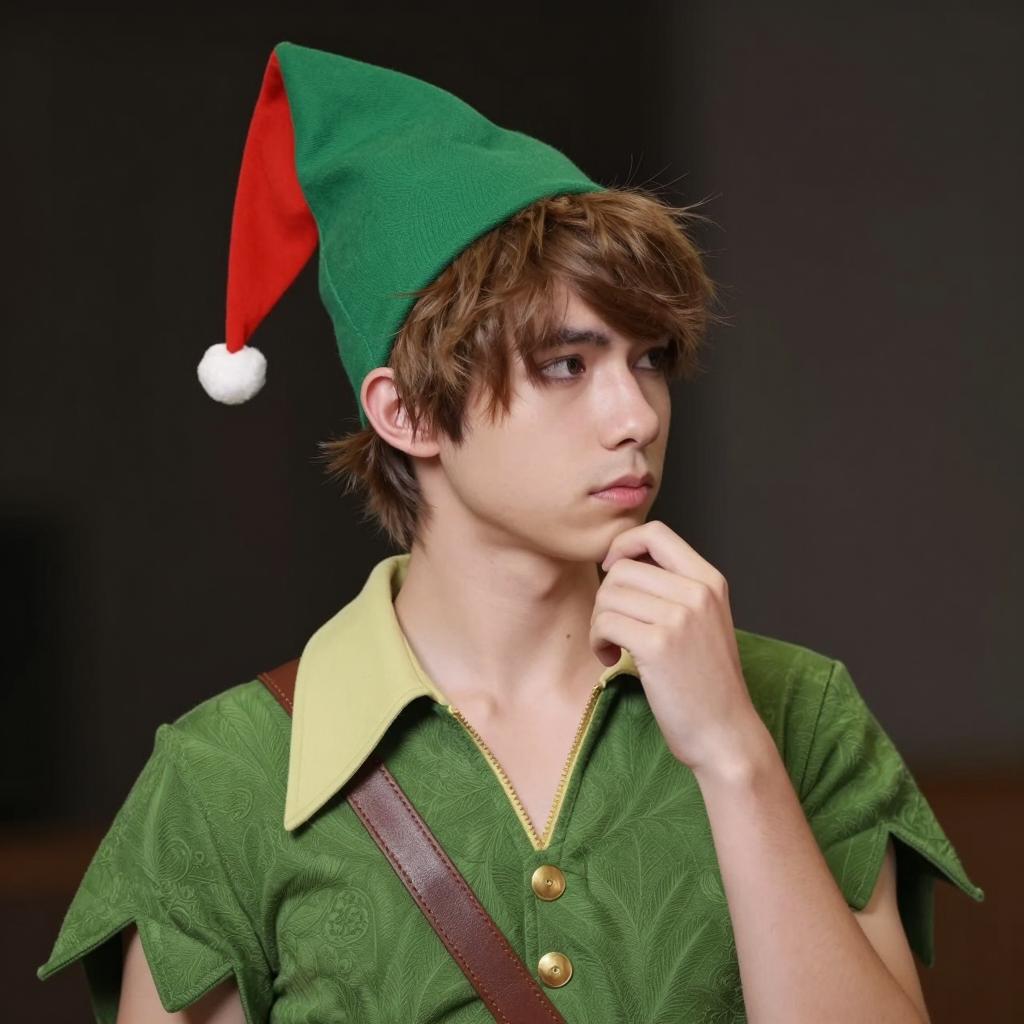 A young man dressed in a detailed, photorealistic Peter Pan costume, featuring a green tunic with gold buttons and a brown leather strap, along with a festive green and red pointed hat. The fantasy cosplay portrait captures his thoughtful expression against a dark, blurred background, highlighting the vibrant colors and craftsmanship of the outfit.