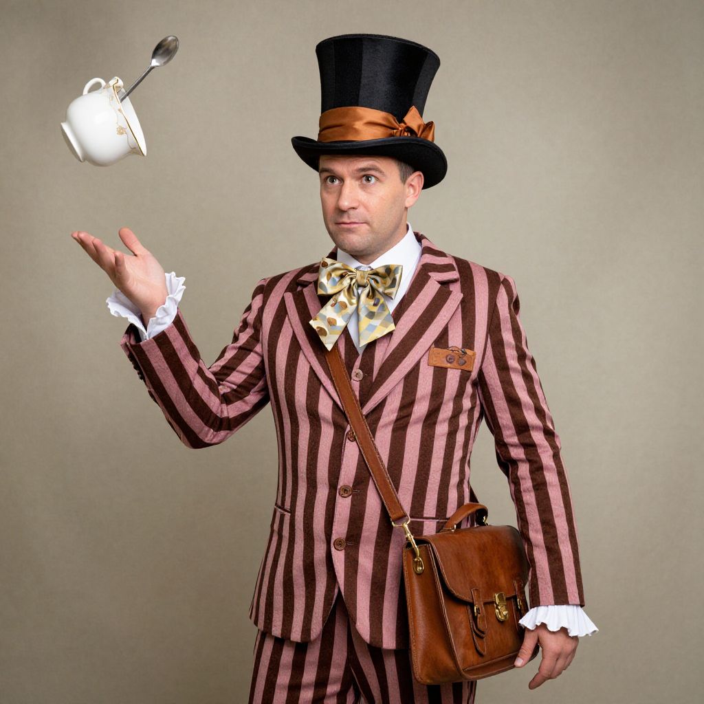 A man in a mad hatter costume, complete with a striped suit, a top hat with a ribbon, and a satchel, posing in front of a whimsical backdrop with a teacup and a spoon floating in the air