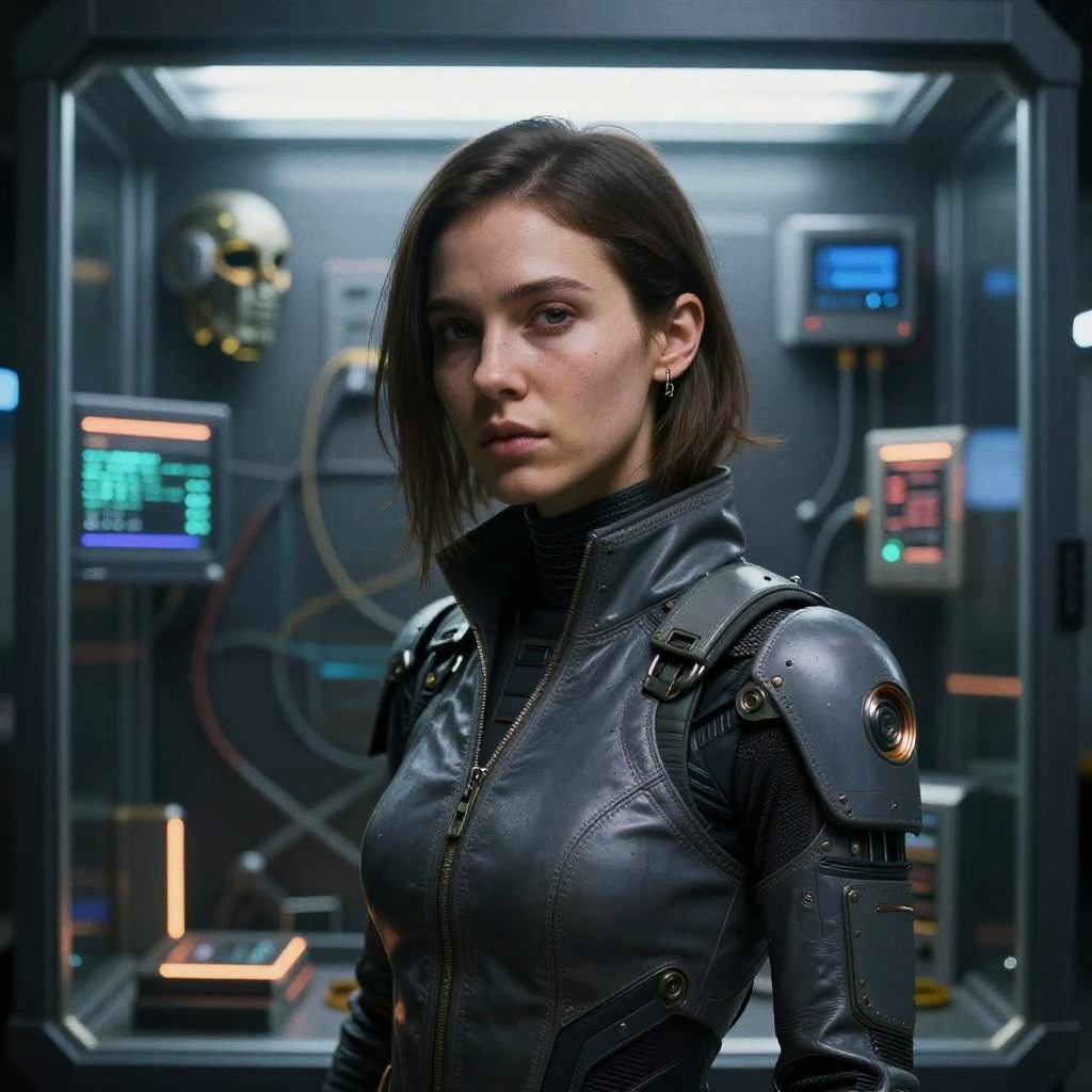 Ultra-realistic portrait of a young woman with short brown hair wearing a black leather cyberpunk suit with metallic armor details. She is standing in front of a futuristic electronic display case with glowing screens and cables, under three-point dramatic lighting. The setting evokes a high-tech, Blade Runner-style environment.