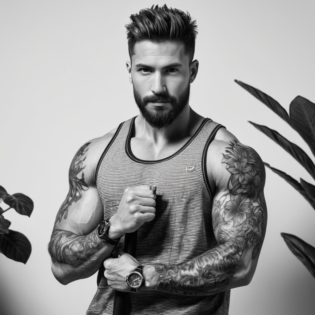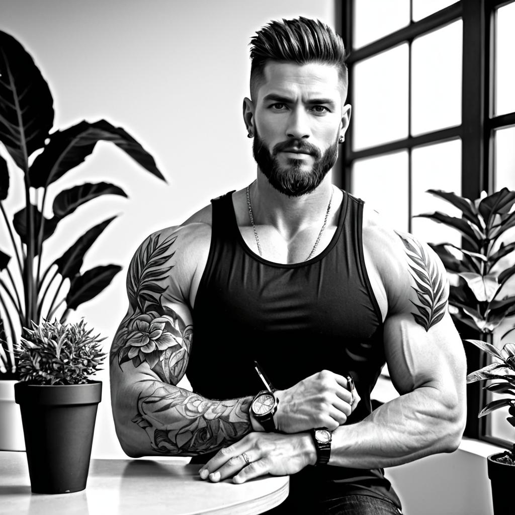 Black and white portrait of a muscular bearded man with tattoos on both arms, wearing a sleeveless tank top with a leafy design. He is seated at a table, with his hands clasped together, in a room decorated with leafy potted plants near a window.
