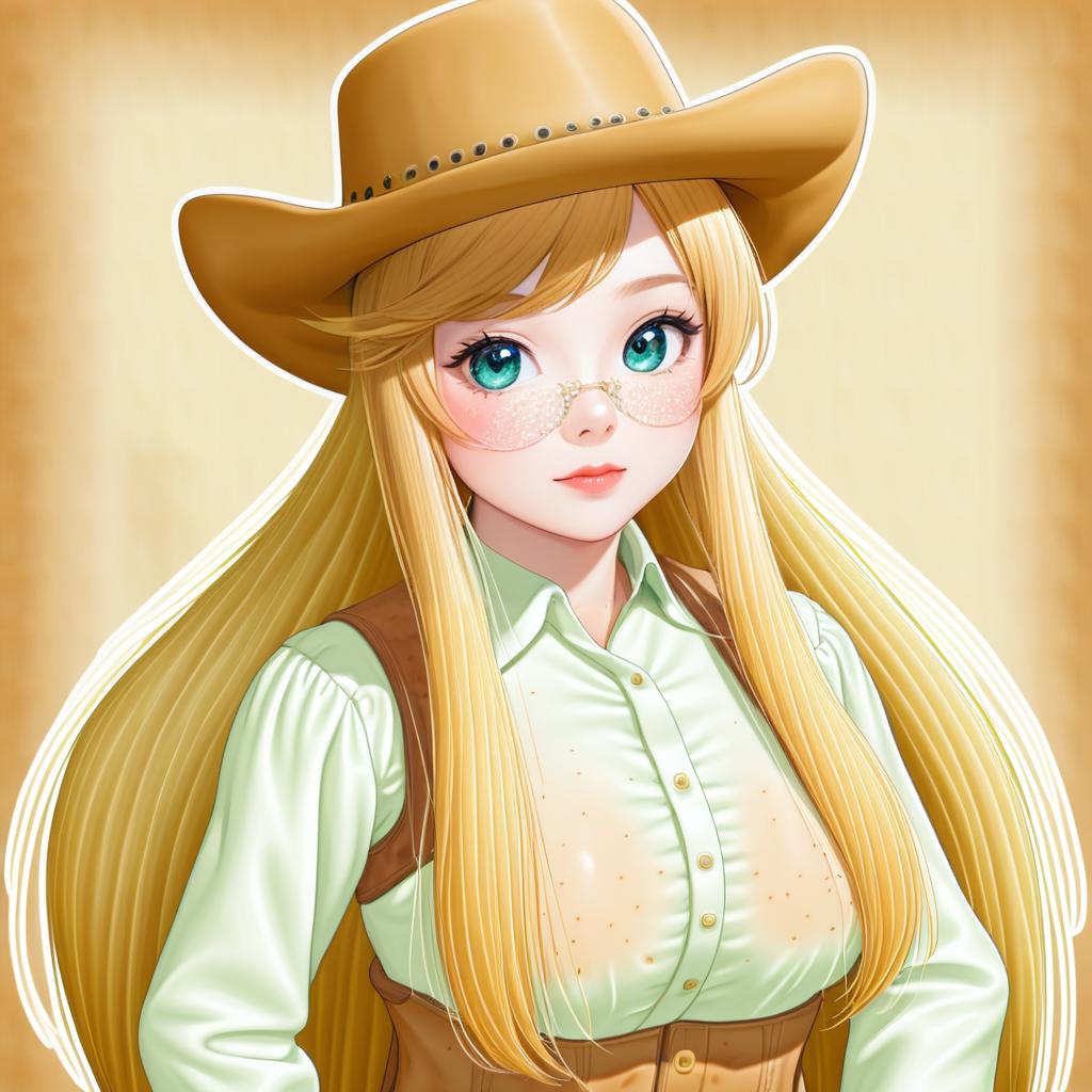 Applejack, my little pony, 1girl, green eyes, blonde hair, low-tied long hair, long hair, large breasts, freckles, cowboy hat, by artist ya-man, animagine