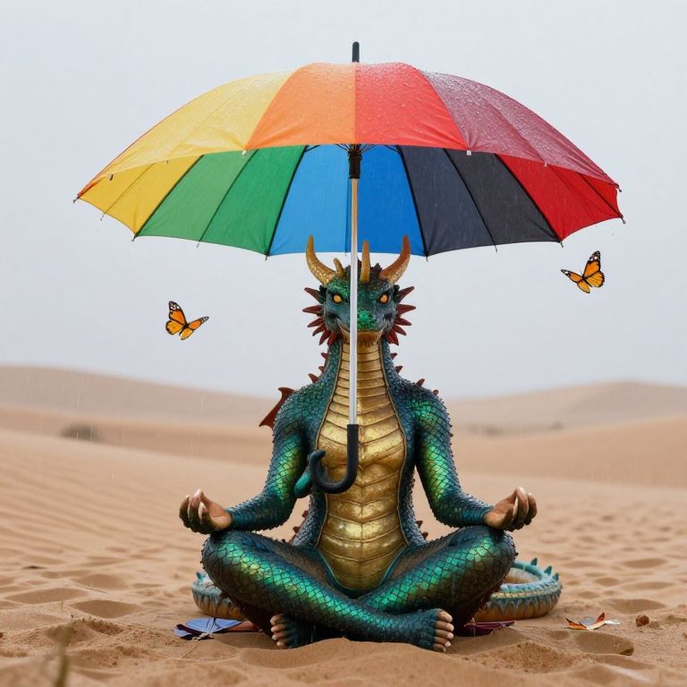 Rain-soaked dragon meditates serenely beneath a vibrant rainbow umbrella, surrounded by delicate butterflies as gentle rain falls in a tranquil desert landscape.