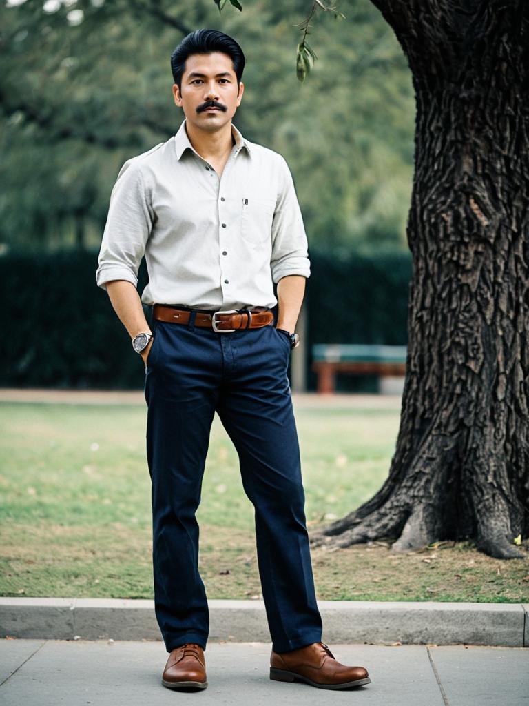 Man chino outfit costume, 1boy, male focus, solo, belt, hand in pocket, pants, brown footwear, facial hair, outdoors, shirt, full body, standing, blurry, brown belt, wristwatch, mustache, shoes, black hair, tree, white shirt, watch, looking at viewer, blurry background