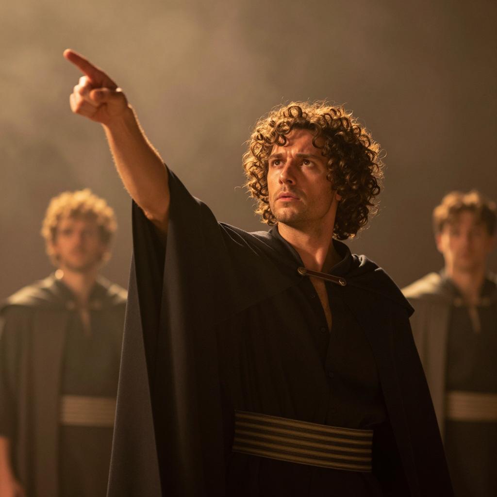 Two men in a dimly lit room. The man on the left has dark hair, wears a brown robe with a metallic chest piece. The man on the right has dark hair, wears a white shirt with a gray vest, holds a metallic goblet in his right hand. The man on the right looks at the man on the left with a serious expression. Background includes dark, ured walls and indistinct equipment. Both men are positioned facing each other, standing close.