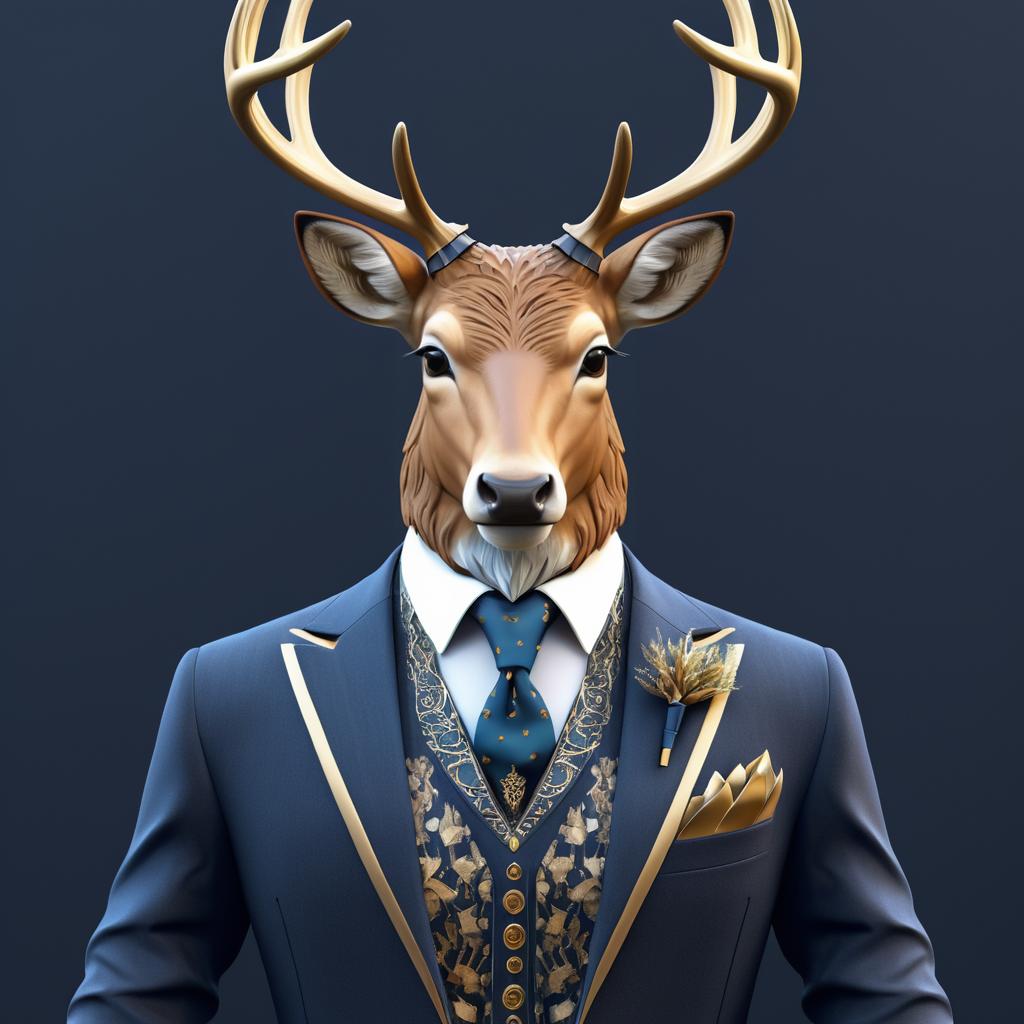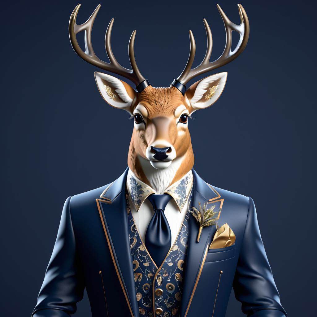 Highly detailed anthropomorphic deer character dressed in a stylish blue suit with gold accents, including a patterned waistcoat, white shirt, and blue tie. The deer has prominent antlers and a lifelike facial expression, combining animal features with a professional and formal human attire look, set against a dark background.