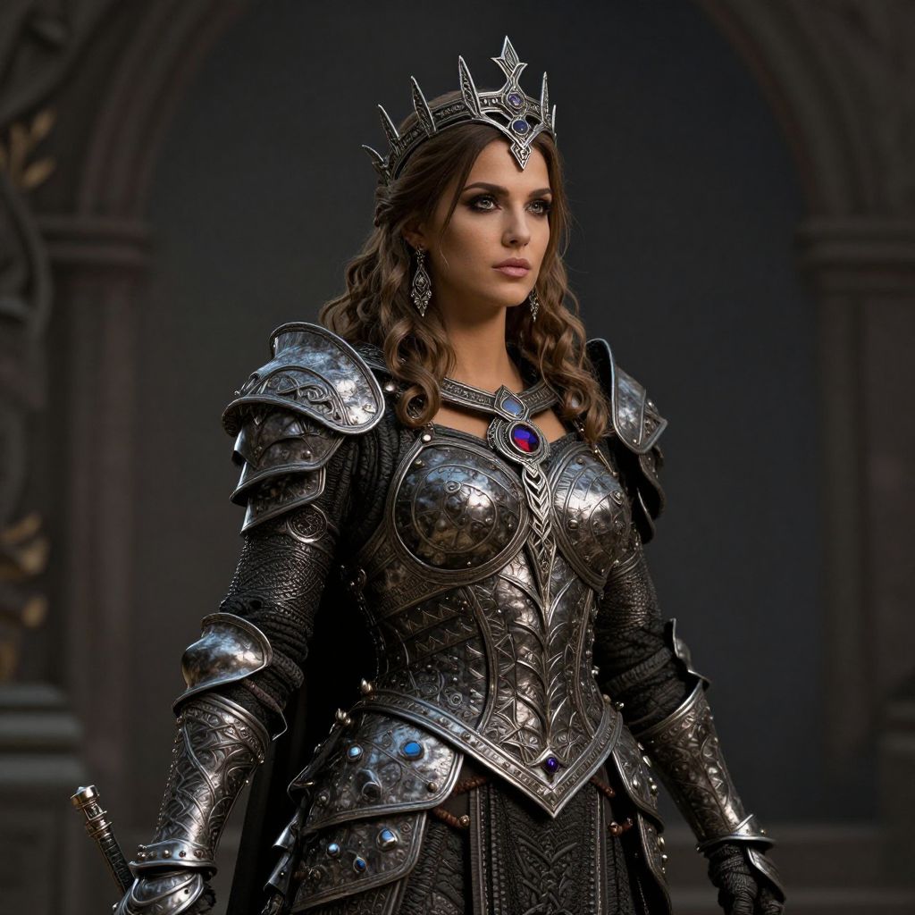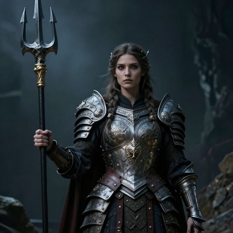 A fantasy depiction of the goddess Badb, goddess of war and death, adorned with intricate armor and a trident, set against a dark, mystical background.
