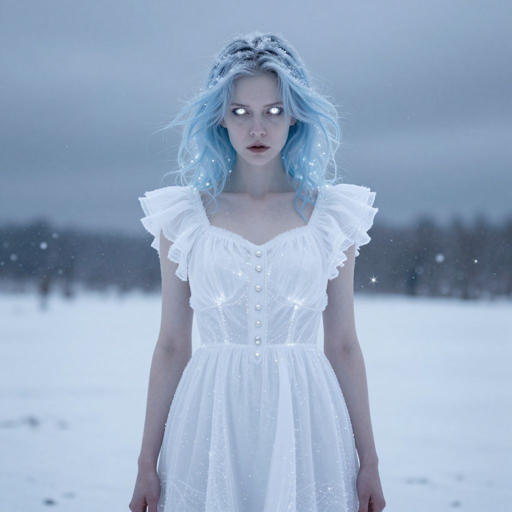 A surreal, digital artwork of a pale-skinned woman with icy blue hair and glowing white eyes, standing in a snowy landscape. She wears a luminous white dress with frilled shoulders and pearl buttons, surrounded by ethereal light and sparkles. Her expression is intense, and the background features softly falling snowflakes against a cloudy sky. The overall vibe is otherworldly and magical.