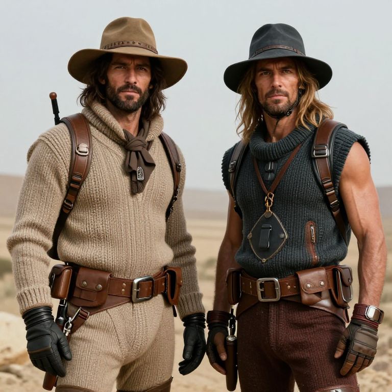 Two hikers in futuristic, hyper-detailed, tetrad color palette outfits with muscular structure, knit fabrics, and nylon elements, wearing hats and gear inspired by El Topo by Alejandro Jodorowsky, in a photo-realistic, ultra-realistic setting.