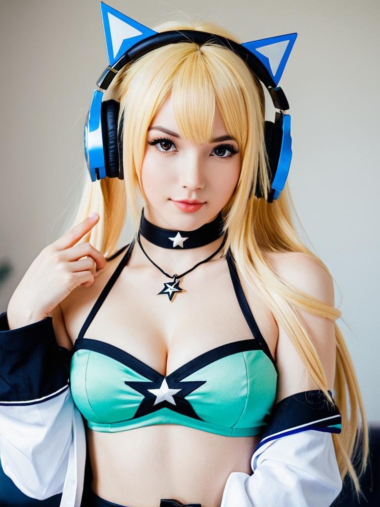 Photo-realistic cosplay photo of person in albacore (azur lane) costume. 1girl, fang, hair between eyes, green eyes, star in eye, blonde hair, very long hair, long hair, ahoge, small breasts, navel, collarbone, headphones, bare shoulders, wristbandlifestyle stock photo, shallow depth of field, lifestyle stock photography, shallow depth of field, natural lighting, warm tones, soft background blur, candid moments, vibrant colors, realistic textures, modern casual clothing. full body shot