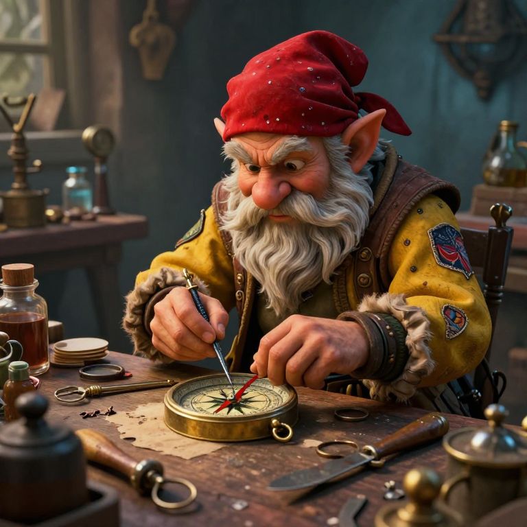 In this captivating, hyper-detailed portrait, a fantasy gnome artificer tinkerer is meticulously crafting a compass, surrounded by an array of intricate tools and materials. The gnome, adorned with a vibrant red bandana and a long, flowing beard, is crouched in a dynamic pose, engrossed in his work. His attire, a mix of rugged and ornate elements, includes a yellow jacket with various patches and a red hat, adding to his adventurous appearance. The workspace is cluttered with an assortment of objects, including jars, bottles, and tools, scattered across a table that is bathed in natural lighting. The scene is rich with textures, from the smooth metal of the compass to the rough, weathered surfaces of the tools. The overall composition is balanced, with the gnome centrally positioned, drawing the viewer's eye to his focused expression and the intricate details of his work. The color grading is beautifully nuanced, with warm tones highlighting the gnome's face and tools, contrasting against the cooler, more muted background. The image is a testament to the skill of the artists involved, capturing the essence of a fantasy world through meticulous attention to detail and a vivid, cinematic aesthetic.