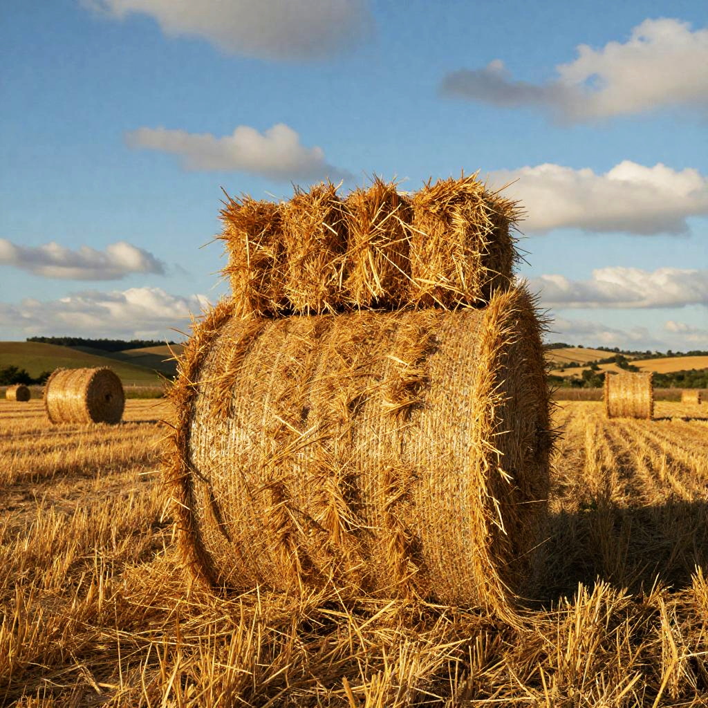 Bales of golden hay stacked in a rustic countryside farm field, warm sunlight casting long shadows, intricate textures of straw visible, a serene rural atmosphere with rolling hills and a blue sky with scattered clouds.