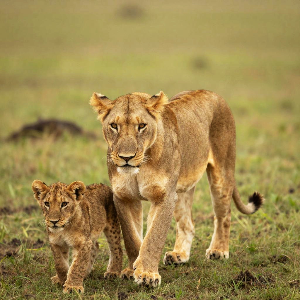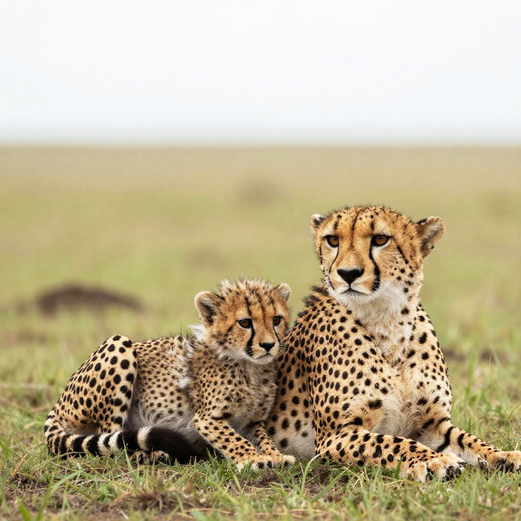 Photograph of a cheetah mother and her cub standing on a grassy plain. The adult cheetah, with a muscular build and yellow fur adorned with black spots, gently nuzzles her cub's face. The cub, smaller and more fluffy, mirrors the adult's spotted pattern but with more pronounced, softer fur. Both cheetahs have black-tipped tails and alert, golden eyes. The background is a blurred, greenish field, emphasizing the cheetahs' detailed, focused foreground. The sunlight highlights their fur textures, creating a warm, natural atmosphere.