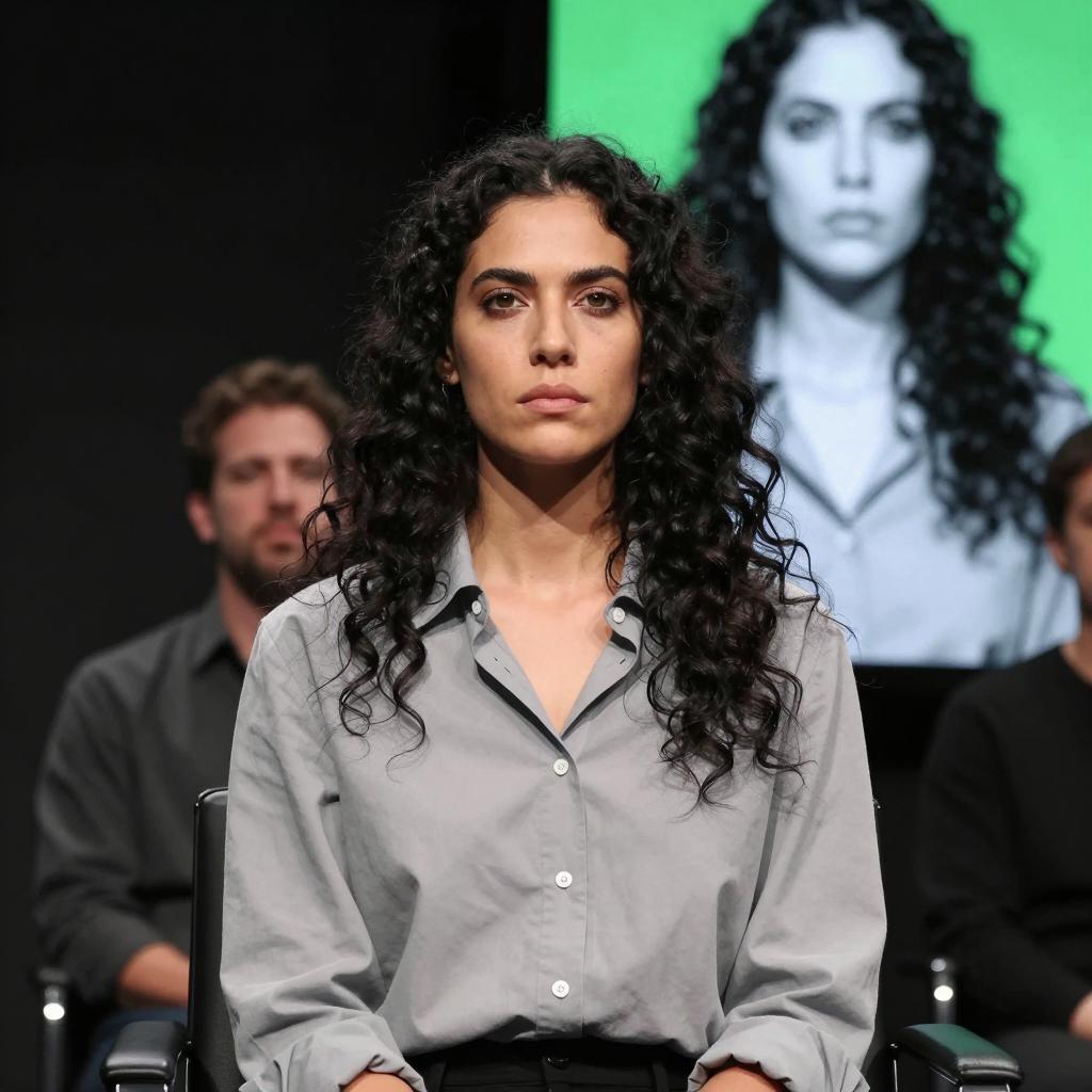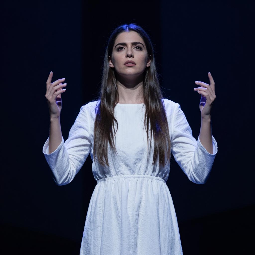 Woman with long dark hair in a white, long-sleeved, loose-fitting dress stands centered, arms slightly raised, fingers extended. Blue lighting illuminates her from above. Dark, blurry background. Intense, focused facial expression.