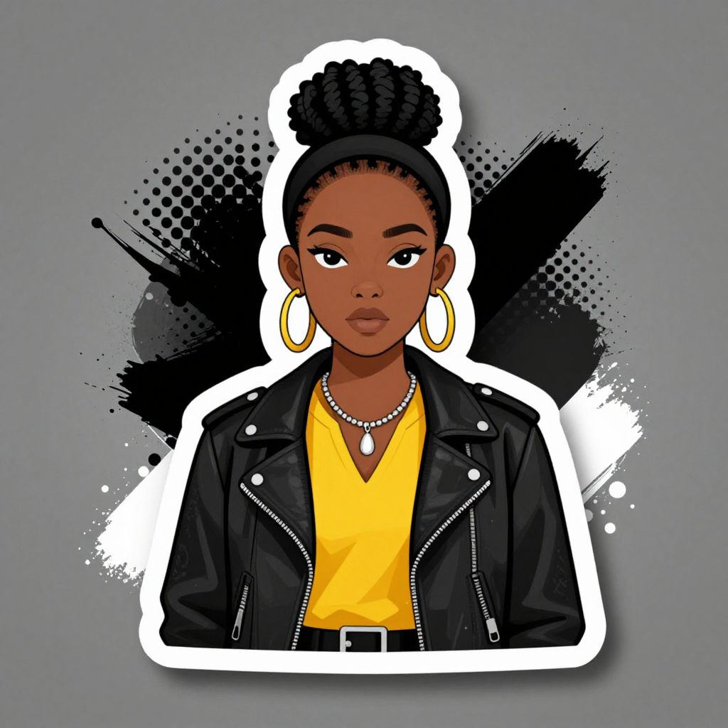 The image features a cartoon-style sticker art design of a black-skinned woman with a bloger style. She has her hair styled in a high bun with braids, adorned with a black headband. The woman is wearing a yellow shirt with a black leather jacket, accessorized with large hoop earrings and a necklace. The background is a gray gradient with abstract black and white patterns, creating a striking contrast with the vibrant colors of the woman's attire. The overall composition is balanced, with the woman centrally positioned, and the background elements adding depth and visual interest to the scene.