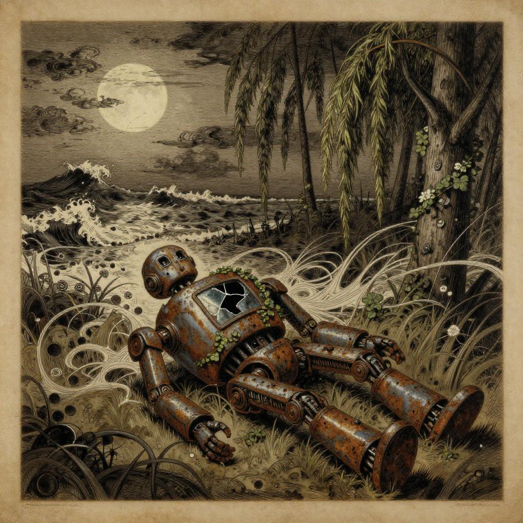 Detailed illustration of an abandoned, rusted robot lying on the ground in a swampy, moonlit wetland setting. The metal robot shows signs of decay with a broken glass panel on its chest and is partially reclaimed by nature, covered with ivy and flowering vines. The background features tall willow trees, dramatic waves crashing under a full moon, and swirling wind patterns, rendered in brown tones on aged paper with bold ink lines in a cinematic, surreal style.