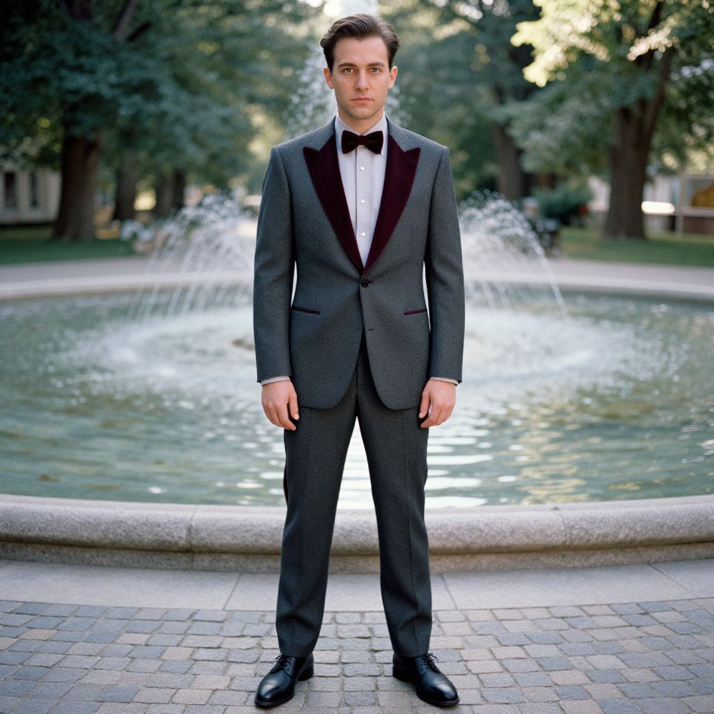 A man, charcoal gray tuxedo, shawl collar, light gray dress shirt, burgundy velvet bow tie, matte black oxford shoes, cobblestone pathways, tranquil fountains, anscochrome analog film, confident expression, soft sunlight filtering through trees. Man has masculine face and piercing eyes