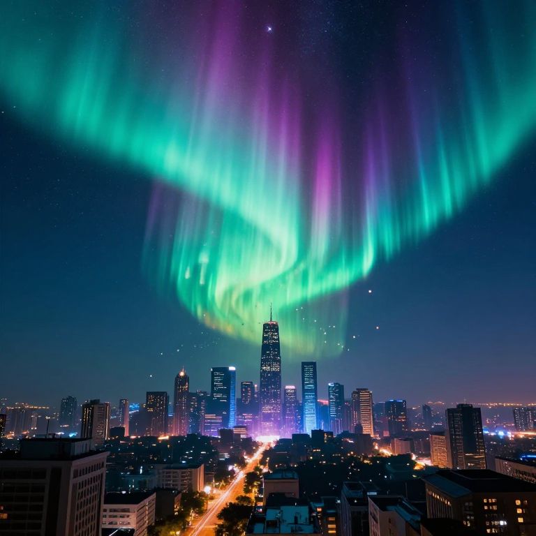Photograph of a city skyline at night with vibrant green and purple Northern Lights streaking across the starry sky. Tall buildings and streetlights illuminate the