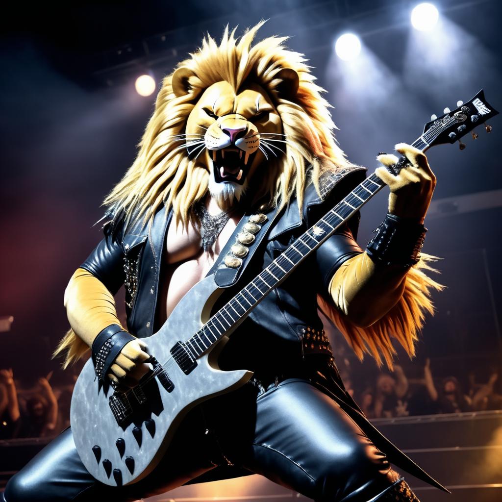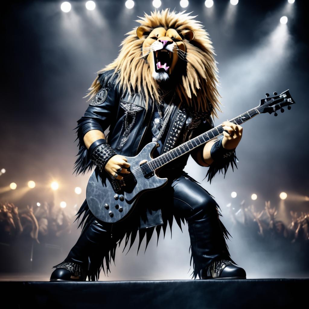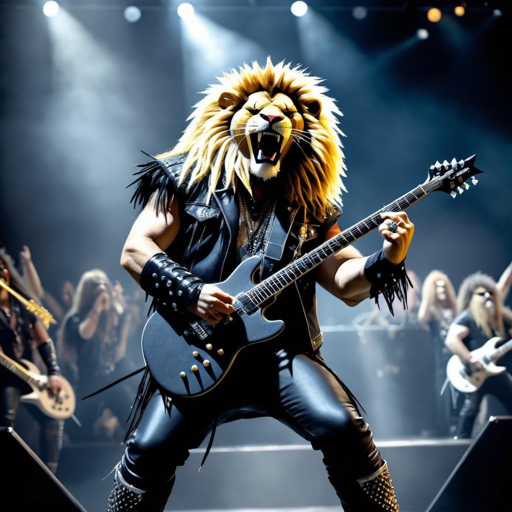 Anthropomorphic lion dressed as a heavy metal rock star, playing guitar on stage before a headbanging crowd, dark and photorealistic.