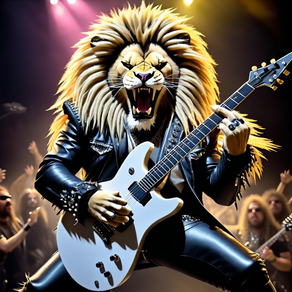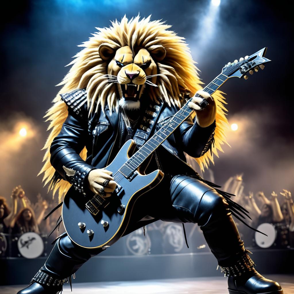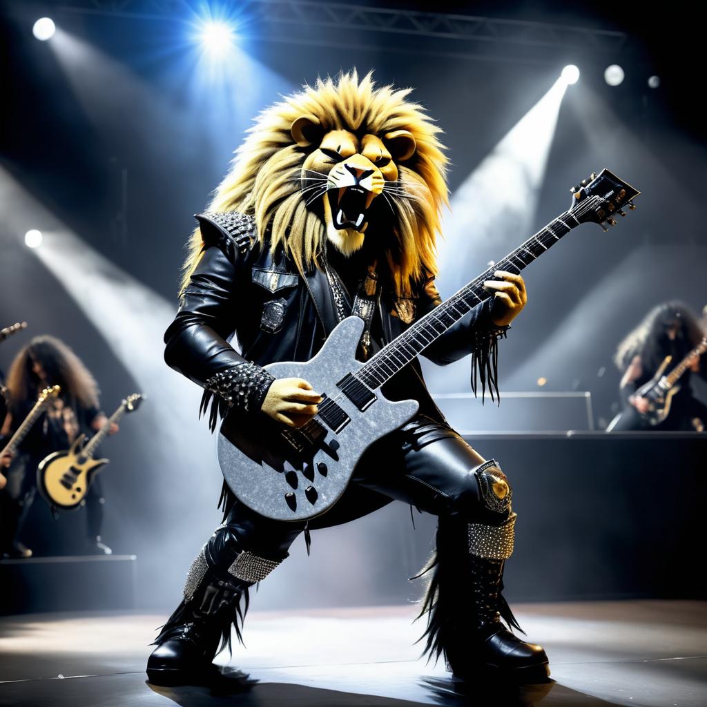 Anthropomorphic lion dressed as a heavy metal rock star, playing guitar on stage before a headbanging crowd, dark and photorealistic.