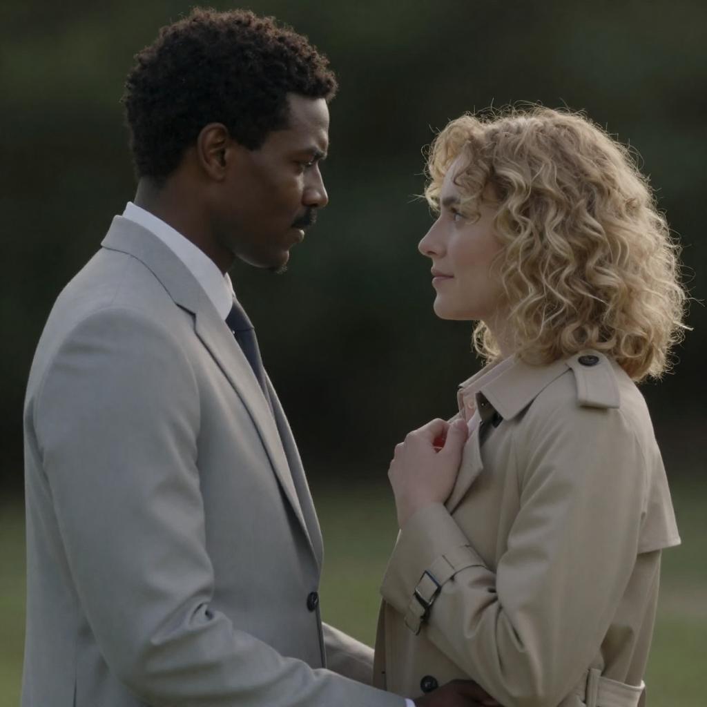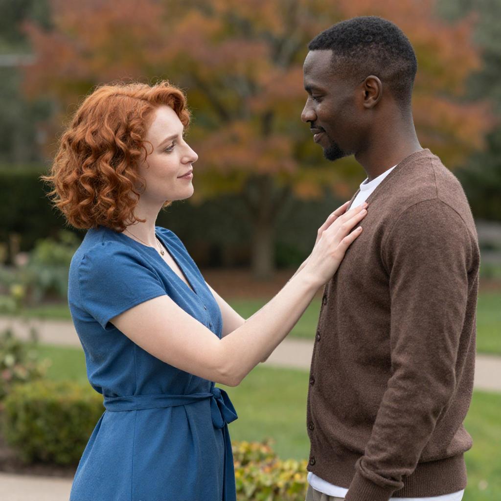 Photograph of a woman with short, curly red hair in a blue dress, gently touching the shoulder of a dark-skinned man with short black hair in a brown cardigan. They stand in a garden with autumn-colored trees and greenery, both looking at each other with warm expressions.