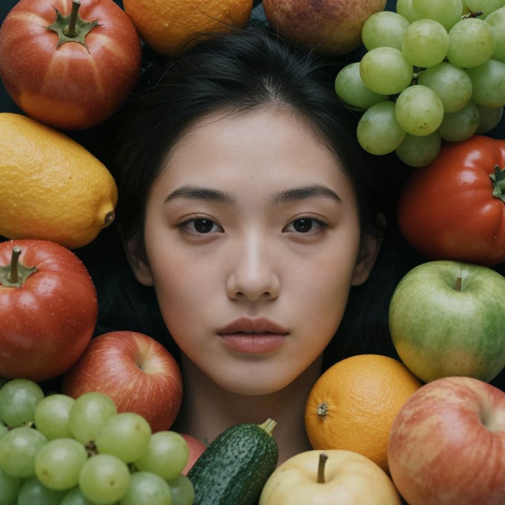 A photograph of an attractive female model with a symmetrical face surrounded by photorealistic fruits and vegetables, vivid colors, soft lighting, atmospheric, cinematic 8 k