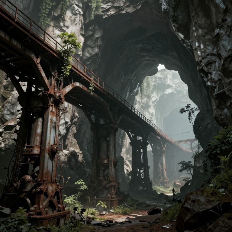 The image depicts a futuristic, industrial bridge spanning an underground cave. The bridge, constructed from weathered metal, features a series of arches supported by intricate, mechanical pillars. The scene is bathed in a muted, industrial light, casting long shadows and highlighting the textures of the rusted metal and the rough, rocky walls. Vegetation, including small trees and vines, begins to reclaim the space, growing around the pillars and along the edges of the bridge. The overall atmosphere is one of decay and abandonment, yet there is a sense of resilience as nature slowly encroaches upon the man-made structures. The composition is dynamic, with the bridge arches leading the eye towards the distant, misty horizon, creating a sense of depth and scale. The image evokes a sense of the grimdark future, where industrial ruins and cyberpunk aesthetics coexist, hinting at a world where technology and nature are in a constant, uneasy balance.