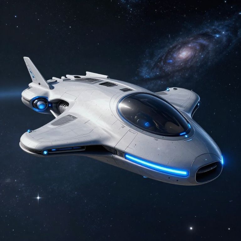 Futura, a concept spaceship design hovering above an alien planet, smooth metallic surfaces with glowing blue accents, advanced propulsion systems visible, stars and galaxies in the background, sci-fi theme with detailed textures and atmospheric perspective