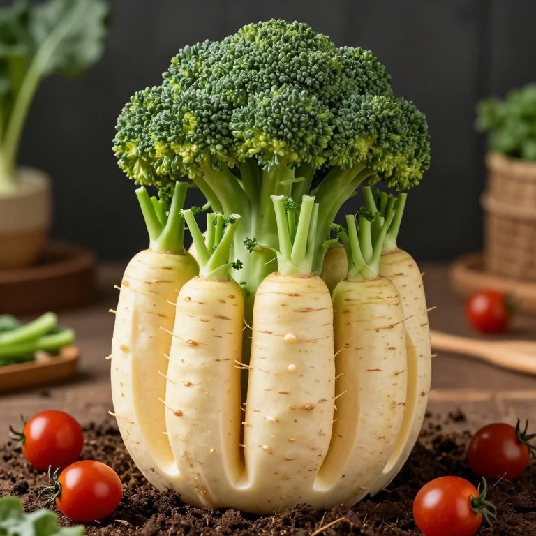 Giant hollow turnip cradles four parsnips with vibrant green tops, nestled within its carved interior, while broccoli crowns the top, surrounded by soil and cherry tomatoes scattered around its base.