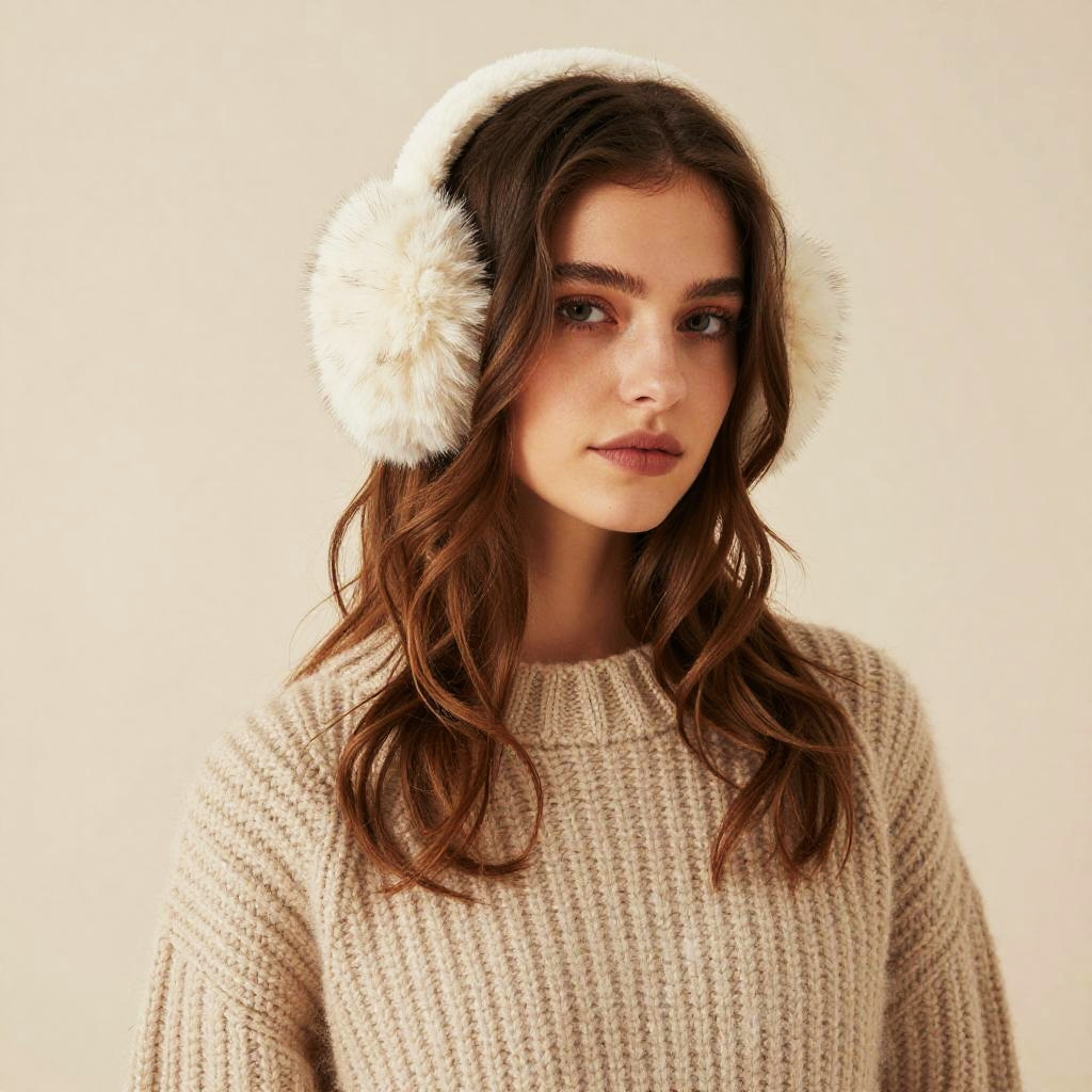 Chunky Knit Sweater, woman with messy ponytail and chunky knit mittens looking at the camera