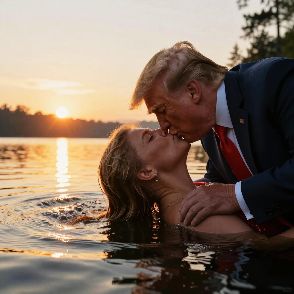 Photograph of Donald Trump and Melania Trump kissing in a sunset-lit lake, Trump in a suit, Melania topless, water rippling around them
