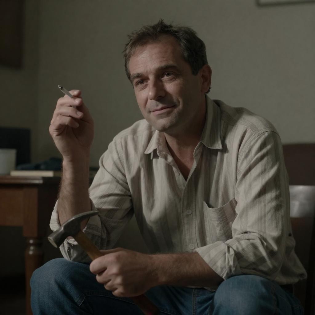 Photograph of a middle-aged man with short brown hair, wearing a striped shirt, sitting in a dimly lit room. He holds a cigarette in his right hand and a hammer in his left. The background includes a wooden table and a shadowy wall. The man's expression is relaxed, with a slight smile.