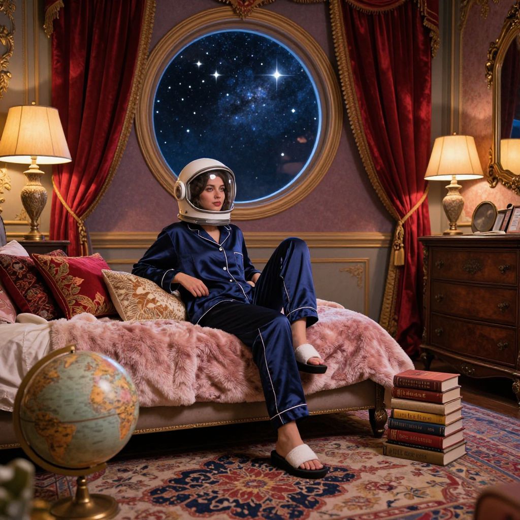 In a luxurious room bathed in vibrant colors, a woman dons an astronaut helmet, sitting comfortably on a bed adorned with a soft and cozy pijama. The room exudes opulence with its rich textures and intricate details. A large round window frames a breathtaking view of the starry night sky, while a lamp with a warm glow casts a soft light, illuminating a globe and a stack of books. The room's decor includes a patterned rug, a plush pillow, and a neatly arranged dresser, all contributing to a sense of comfort and elegance. The interplay of colors, from the deep blues of the pajamas to the fiery hues of the curtains, creates a harmonious and visually appealing atmosphere.